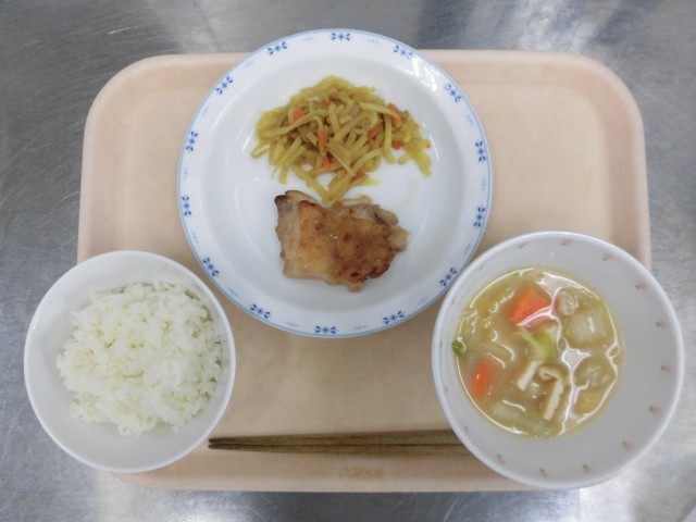 ごはん 鶏肉の照り焼き カレーきんぴら みそちゃんこ汁 牛乳