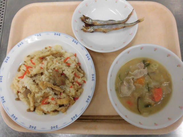 鶏ごぼうおこわ 焼きししゃも 呉汁 牛乳