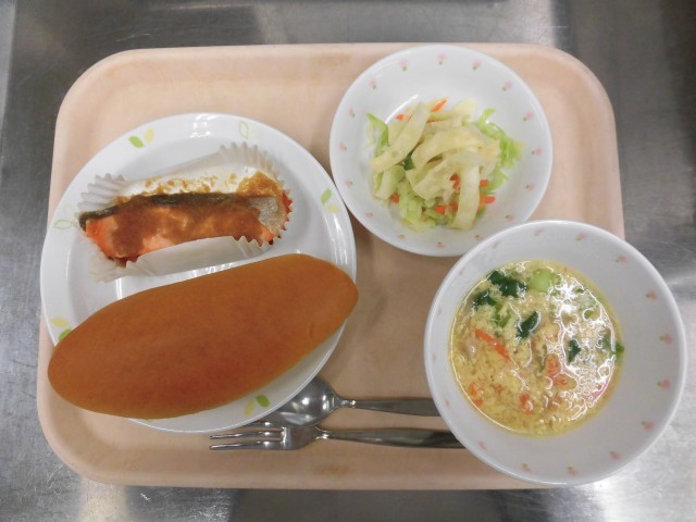 パンプキンパン 鮭のステーキソース パリパリサラダ チーズのふわふわスープ 牛乳