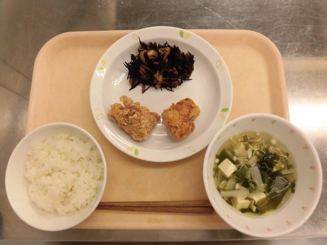 ごはん 鶏の唐揚げ ひじきの炒め煮 ねぎと大根のすまし汁 牛乳