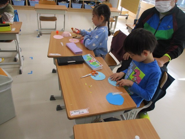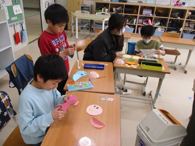 丸い形をつかって~わかたけ学級 公開日 2026/02/24 更新日 2026/02/24 今日のできごと わかたけ学級の低学年の図工の学習です~丸い形の飾りを付けて、お花や小鳥などを作る活動に取り組みました~作りながら、はさみの使い方やのりの付け方などもしっかり学習しています・・・