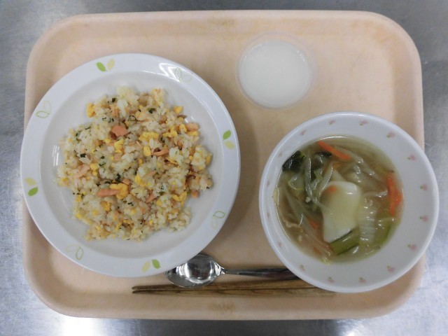 鮭チャーハン わんたんスープ ホワイトゼリー 牛乳