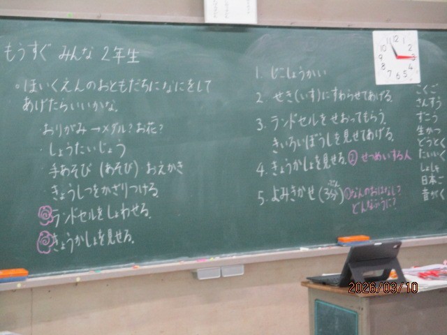 もうすぐみんな2年生~1年 公開日 2026/03/10 更新日 2026/03/10 今日のできごと 生活科の学習です~今度小学校を訪れる保育園の子どもたちに、どんなことをしてあげようか、計画を立て準部する活動に取り組んでいました~