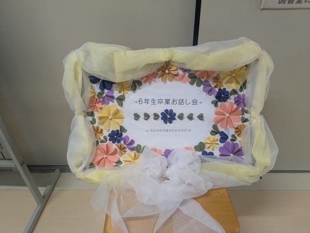 カエルの子はカエルクラブ支援委員会の皆様による卒業おはなし会が6年生に向けて実施されました。この6年間に読み聞かせた本の展示、素敵な飾り付けで、いつもの図書室の雰囲気が別の空間になっていました。蜘蛛の糸は、真っ暗な図書室でパネルシアターを用いての読み聞かせでした。子どもたちの息づかいが聞こえてきそうでした。