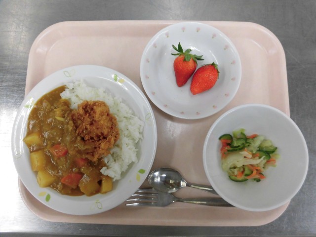 チキンカツカレー フレンチサラダ いちご 牛乳