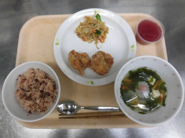 赤飯 鶏の塩唐揚げ ごまあえ お祝いすまし汁 ぶどうゼリー ジョア