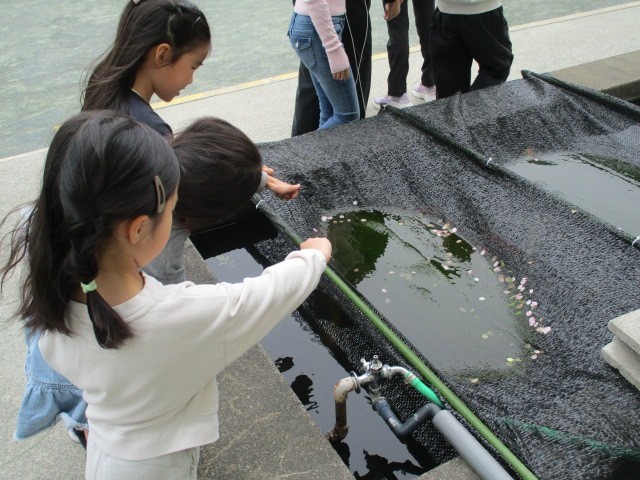 用賀小の池にいる鯉のえさやりをしてくれる子どもたちも・・・