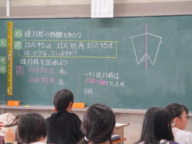 つり合いのとれた線対称な図形の対応する辺の長さや角の大きさについて調べ、まとめる活動に取り組んでいました~