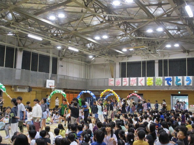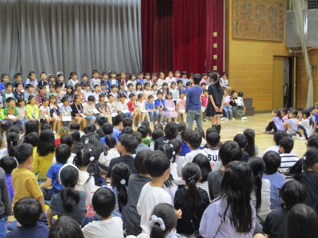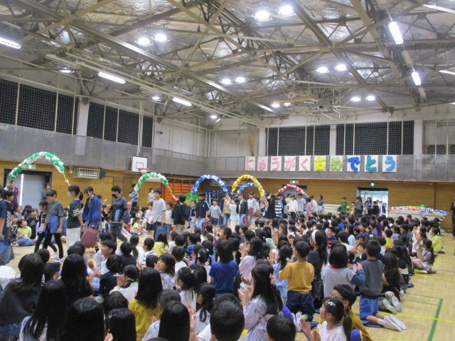 全校児童が体育館に参集して、1年生を迎える会を開きました~