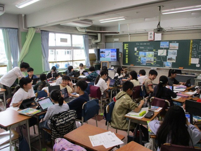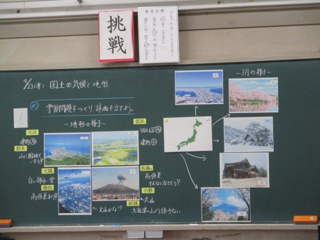 国土の気候と地形~5年 公開日 2026/04/23 更新日 2026/04/23 今日のできごと 社会科の学習です~5年生では、国土の地形や概要を理解するとともに、自然環境に適応して生活していること理解していきます~さまざまな資料をもとに、学習問題づくりから学習が進んでいました~
