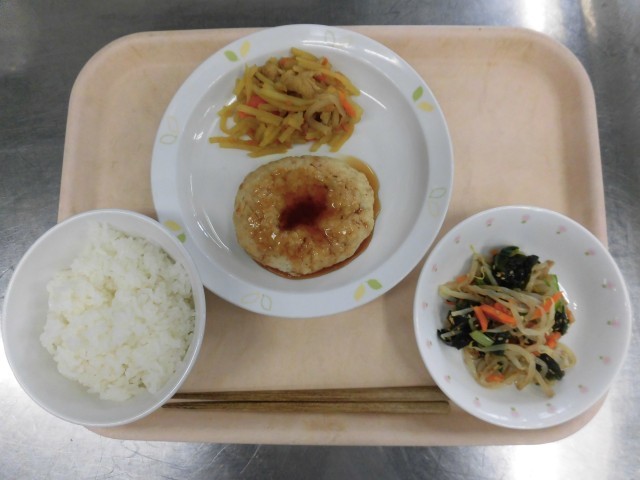 有機米ごはん 和風豆腐ハンバーグ カレーきんぴら もやしとわかめのごましょうゆ 牛乳