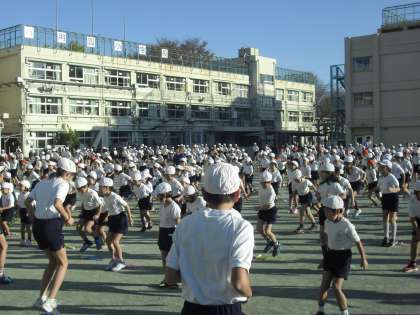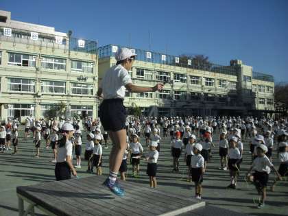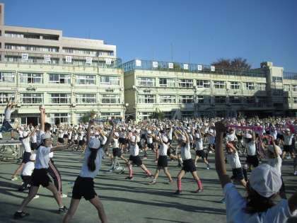 今日の体育朝会は短なわ跳びです。最初はなわを使って準備運動を行います。そのあと、あや跳び、二重跳び、後ろに重跳び、はやぶさ、など体育委員会の5、6年生がたくさんの跳び方を紹介しました。代表児童が難しい技を発表すると、低学年から歓声があがりました。寒さに負けず、みんな元気にいろいろな技に挑戦しています。最後は音楽に合わせて、全員で技を組み合わせて跳びました。2学期の体育朝会は今日で終わりますが、体育の時間や休み時間など、これから本格的な短なわ跳びの時期になります。寒さに負けず、これからもたくさんの跳び方に挑戦していきます。