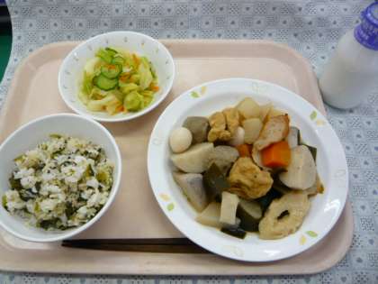 ちくわぶは、関東地方でよく食べられる食材です。給食のおでんには、他にも、つみれやがんもどき、だいこんなど、たくさんの食材が入っていて、栄養いっぱいです。今日も残さずに食べてくれるとうれしいです。