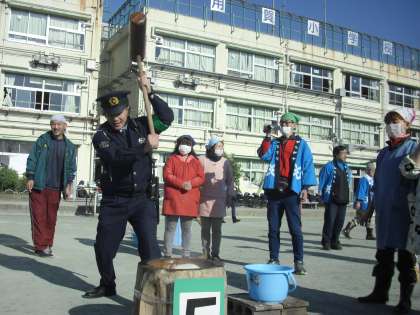 今日は、地域・保護者合わせて、過去最高の220名を超える方々にお手伝いをいただきました。馬事公苑駐在所のおまわりさんも来て、私たちと一緒に、もちつきをしていただきました。