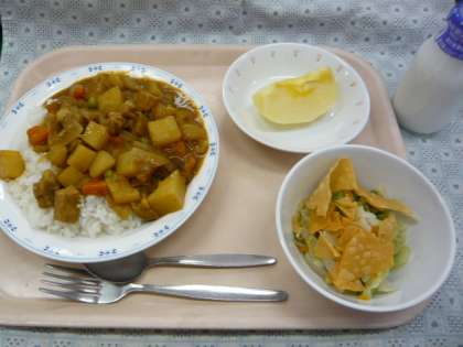 給食のカレーライスには、豚肉やたくさんの野菜が入っていて栄養いっぱいです。今日も残さず食べましょう。今日は福神漬が付く予定でしたが、食材の都合でなくなりました。すみません。
