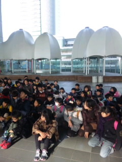 お弁当を食べ、江戸東京博物館の見学です。江戸東京の文化や歴史についてグループごとに展示や映像を観ています。他の学校もたくさん来館していますが、広いので十分に見学できます。