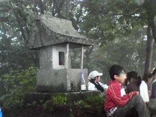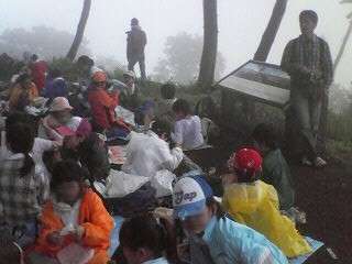 6/11川場だより14 2日目 公開日 2009/06/11 更新日 2009/06/11 校長室より 12時、山頂に着きました。雨乞山の頂上は海抜1067.8m。霧がかかっていましたが、一瞬、ガスが切れて周りの景色が見えました。頂上でお昼を食べました。がんばって登ったので、ご飯がおいしいです。