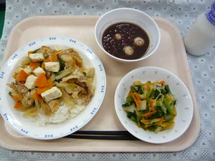 小豆には、おなかの中をきれいにしてくれる「食物繊維」がたくさん入っています。今日も残さずに食べてくれるとうれしいです。