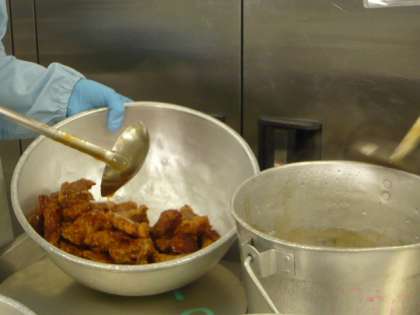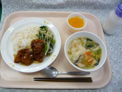 今日は、新メニューの「排骨飯」でした。排骨飯は中国の料理で、下味を付けた豚肉を揚げて、タレを絡めて作ります。「おいしかったです。また、出して下さい。」という声を聞くことができました。残菜もほとんどなく、うれしかったです。