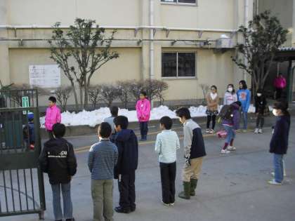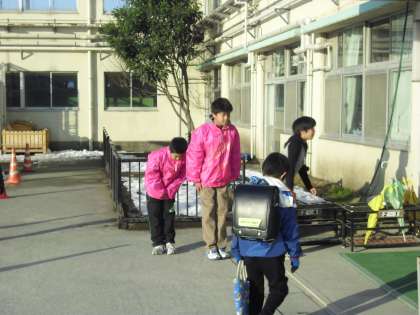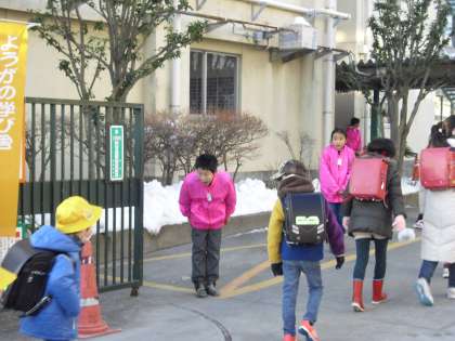 今日と明日は「おはようコミュニケーションデー」です。三つの地域運営学校でつくる「ようがの学び舎」(京西小学校、用賀中学校、用賀小学校)では街に「あいさつの輪」が広がることを願い、平成16年度から「あいさつ運動」に取り組んでいます。本日と明日、朝の7時50分から8時20分まで、今年度最後になりましたが、「おはようコミュニケーションデー」を三校と地域全体で取り組んでいます。先日降った雪がまだたくさん残っていますが、用賀小学校の運営代表委員会の子どもたちが、登校してきた子どもたちに元気にあいさつをして、気持ちの良い一日をスタートしています。用賀小学校の子どもたちは自分から進んで気持ちのよい、元気なあいさつができます。あいさつは心と心をつなぐ魔法の言葉です。明日もまだ雪の残る寒い朝ですが、元気に心のこもった「おはようございます。」のあいさつが響き渡ります。