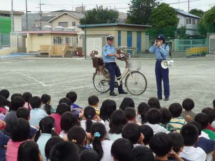 朝から雨が落ちてきそうな天候でしたが、自転車教室が無事に終わりました。用賀小学校では、毎年3年生が自転車の正しいのり方教室を行ないます。玉川警察からは、4名もの警察官の方に来ていただいて、ていねいなご指導をいただきました。