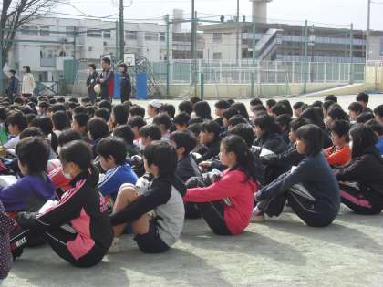 今日の避難訓練は子どもたちには予告なし、しかも、放送機器は使えず職員の肉声で伝達するという設定で行いました。授業中に主事室から出火という想定で行いましたが、子どもたちは、「お・か・し・も」の約束を守り、素早く避難することができました。しかしながら、全員の子どもたちが、ハンカチを口と鼻にあてることができていなかったため、その点については「不合格」としました。私たちは全員の命を守ることを常に考えて、今後とも厳しく訓練に臨みます。ご家庭でも、ハンカチを持たせるようよろしくお願いいたします。