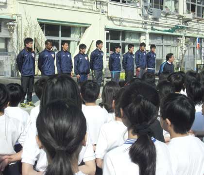 今日は、今年の箱根駅伝において総合優勝を達成した、日本体育大学駅伝部の選手に来ていただき、5・6年生と一緒に走ってもらいました。5・6年生は、2月20日の駅伝大会に向けて、クラスごとにまとまり、一人一人が真剣に練習をしています。この企画は、日体大駅伝部 別府健至監督の協力があり、今年で3回目になります。