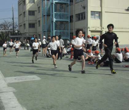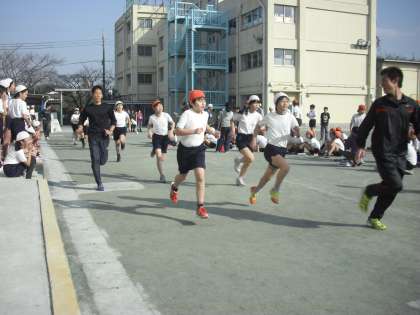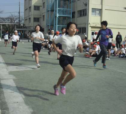クラスごとにウォーミングアップを楽しんだ後は、1000m走のタイムトライアルです。大声援の中、駅伝選手も一緒に走ってくれたので、子どもたちは大興奮でやる気が爆発しました。子どもたちに激励の声をかけながら、1000mを6レース走ってくれた選手に感謝の気持ちでいっぱいです。おかげさまで、自己新記録を樹立した子どもがたくさんでました。