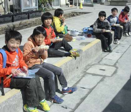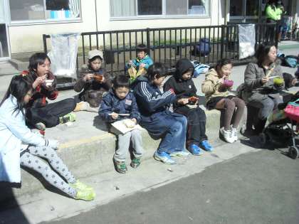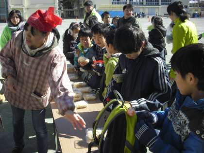 防災ラリーで勉強したあとは、豚汁とアルファー米のご飯をいただきました。おいしい豚汁とご飯に子どもたちは笑顔いっぱいです。