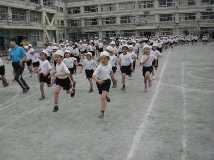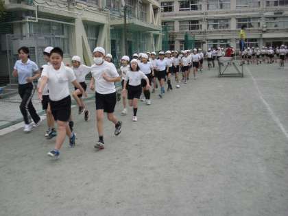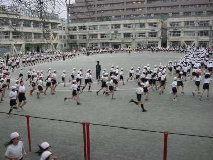 今日の体育朝会はマラソン朝会です。朝の気温は3度、北風が強く雪が舞い、私の腕にも鳥肌が立つほどの寒さでした。しかし、子どもたちは寒さに負けず元気よく走っていました。800人を超える子どもたちが一斉に走りますので、校庭には、低・中・高と3つのコースをつくり、教師が交通整理をしながらケガのないように努めています。軽快な音楽のリズムを聞きながら、自分のペースで距離を刻んでいました。