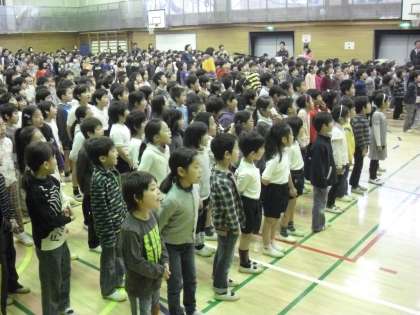 今日の音楽集会は、来週にせまった「6年生を送る会」の練習で『きみとぼくのラララ』を歌いました。1〜5年生が合わせて歌ったのは初めてですが、どんどん声が出て上手に歌えるようになりました。1年生も大きな口を開けて、からだを揺らしながらとっても上手に歌っていました。「6年生を送る会」の最後に、6年生への感謝の気持ちを込めて歌います。各学年の出し物も仕上がってきていますので、3月5日が楽しみです。