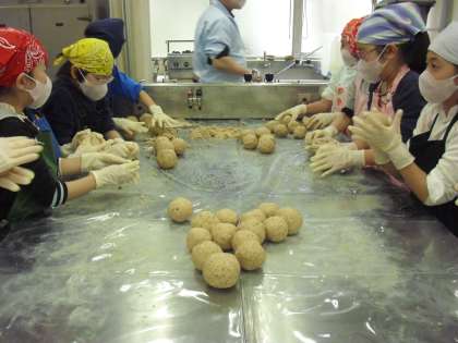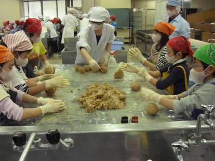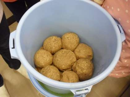 大豆、米麹、塩を押しつぶして、押しつぶして、そのあと丸めて玉にします。そして、ポリバケツに入れて空気を抜きます。雑菌がつかないようにきれいに拭いて、落とし蓋をして重しをかけます。31度の発酵室に入れて、6月位まで熟成させて出来上がります。5年生になったら、手づくりのお味噌を食べるのを楽しみにしていてください。
