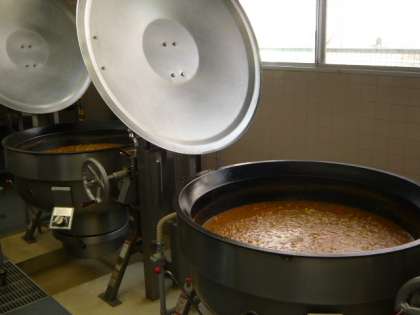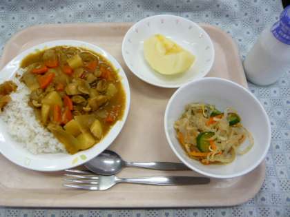 今日の給食は、「カレーライス」です。用賀小学校のカレーは、ルウから手作りしています。そこでクイズです。ルウは、小麦粉とバターと油を炒めて作りますが、どのくらい時間をかけて作っているでしょうか?