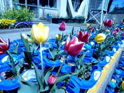 元気にまっすぐ伸びる、新2年生の育てたチューリップ。