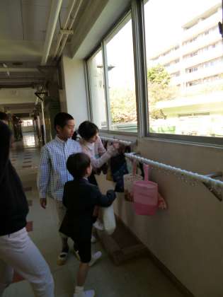 教室の前の廊下では、うわばき袋をかける場所がそれぞれ決められています。