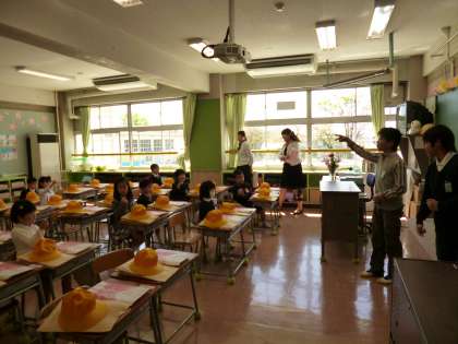初めて訪れた場所にどきどきする1年生に、6年生が優しく声をかけていました。