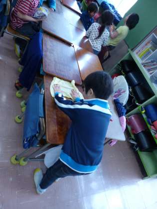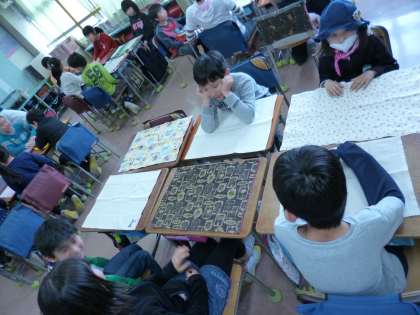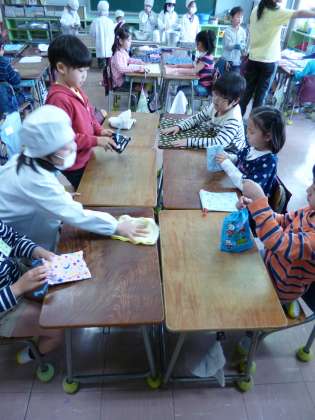 当番の児童が机を台ふきんでふいた後、色とりどりのマットが敷かれ、
