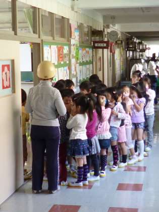 4/15 避難訓練 公開日 2013/04/15 更新日 2013/04/15 今日のできごと 今日は、今年度初めての避難訓練がありました。 給食室から火災発生を想定し、避難するための練習です。 初めてなので校庭までは出ずに、「おかしも」を守って 廊下にならぶことができるか、を確認します。 一年生は、直前に避難の仕方を先生とおさらいし、 おしゃべりせずに、ならび順を確認し、放送の指示を聞いていました。 次回もすばやくならんで移動できるといいですね。