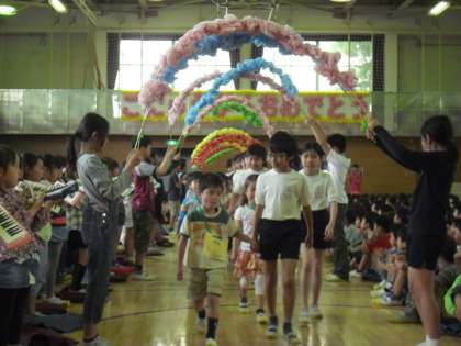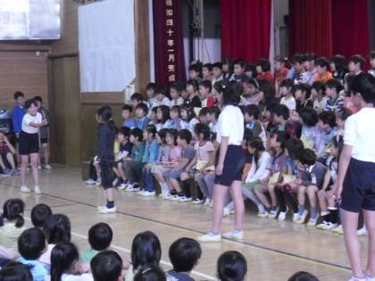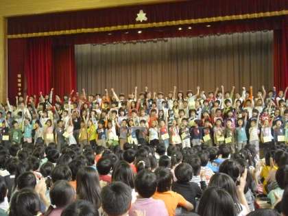 4/17 1年生を迎える会 公開日 2013/04/17 更新日 2013/04/17 今日のできごと 全校児童で1年生を迎える会をしました。歓迎の歌あり、クイズありと、上級生の心のこもった、あたたかなプログラムでした。また、1年生はまだ入学してまだ8日ですが、とても立派な出し物でした。用賀小学校全校児童778人で、平成25年度をスタートしました。