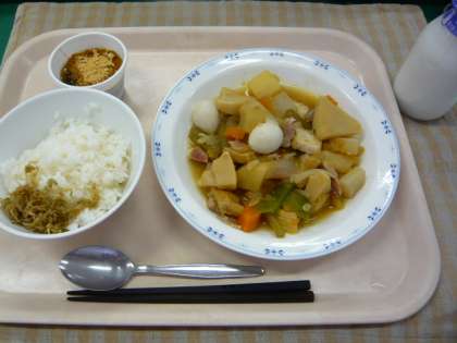 毎月19日は食育の日です。食育の日の献立は、ようがの学び舎で一緒に勉強している京西小学校、用賀中学校と同じ献立です。今日は、春野菜のうま煮でした。新じゃがいも、新たけのこ、新たまねぎ、ふき、さやえんどうの5つの春野菜が入っていました。旬の野菜はおいしく、栄養満点です。給食には、できるだけ旬の食材を取り入れるようにしています。