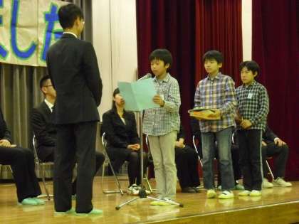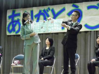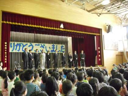 5/2 離任式1 公開日 2013/05/05 更新日 2013/05/05 今日のできごと 昨年度末に用賀小学校を去られた10名の教職員のうち、臼井先生、廣石先生、石井先生、砂岡先生、丹羽先生、氷室先生、高橋主事、野田主事、小林支援員の9名がご出席され、子供たちとお別れをしました。