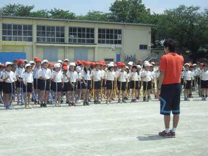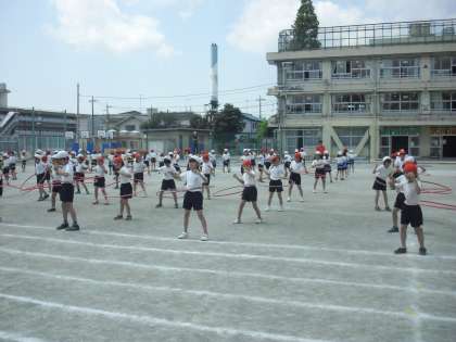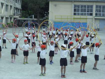 5/15 2年学年練習 公開日 2013/05/15 更新日 2013/05/15 今日のできごと 2年生はフラフープを使って演技をします。休み時間の練習の成果もあり、腰で回したり、2人で転がし合ったりと、皆とても上手に扱えるようになってきました。大勢で心を合わせて表現することにも挑戦します。