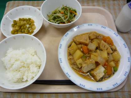 毎月19日は、食育の日です。今月は19日がお休みなので、今日の献立を食育の日の献立にしました。ようがの学び舎で一緒に勉強している、京西小学校と用賀中学校と同じ献立です。今日は酢の物に使った「おかひじき」のクイズを出したいと思います。おかひじきの名前の由来は次のうちのどれでしょうか?