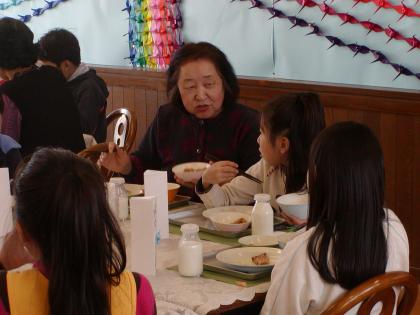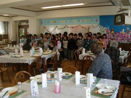 地域の方をご招待してふれあい給食を行いました。子どもたちは心を込めて準備・練習に取り組みました。いざ本番、いつもなら大喜びで話している子どもたちが、お客様をお迎えした緊張から、なかなか話しかけることができません。合奏・合唱からやっと本来の調子に戻りました。お客様に喜んでいただけたことで、満足感を覚えることのできた様子でした。緊張した面持ちで敬語を使って話している子どもたちがとても可愛かったです。