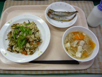 今日の汁ものは、豆腐が入った豆腐汁です。そこでクイズです。豆腐は、何から作られているでしょうか?