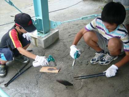 お家からくんせいにしたらおいしくなりそうな物を持ち寄って、網の上に並べていきました。チーズや笹かまぼこが一番人気でした。中には、すでにくんせいにしてあるベーコンを持ってきている人も・・・。煙でいぶしている間に、焼き板をしました。思い思いの大きさに木をのこぎりで切って、バーナーで焼き、水につけてたわしでゴシゴシこすって炭を落とせば出来上がりです。そんなこんなしているうちにくんせいが出来上りました。できたてのおいしいこと。ベーコンもおいしいベーコンになっていました。