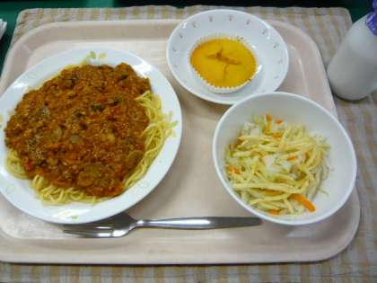 今日の給食は、「スパゲッティミートソース」です。そこでクイズです。今日のミートソースには、何種類の野菜が入っているでしょうか?