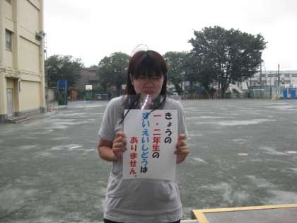 現在風雨が強く、以降の天気予報も悪いので1・2年生の水泳教室は中止します。