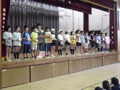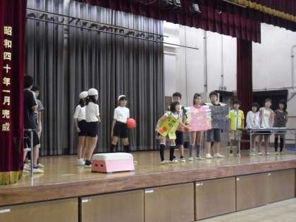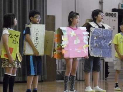 6/13 図書委員会発表集会 公開日 2013/06/13 更新日 2013/06/13 委員会・クラブ活動 図書委員会は寸劇による発表でした。楽しい劇を通して、本は開いたまま伏せて置かないこと、図書室の本には付箋を貼ったままにしたり、線を引いたりしないことなど本を大切に扱うことについて伝えてくれました。はきはきと台詞を言い、小道具も準備をし、わかりやすい発表をすることができました。