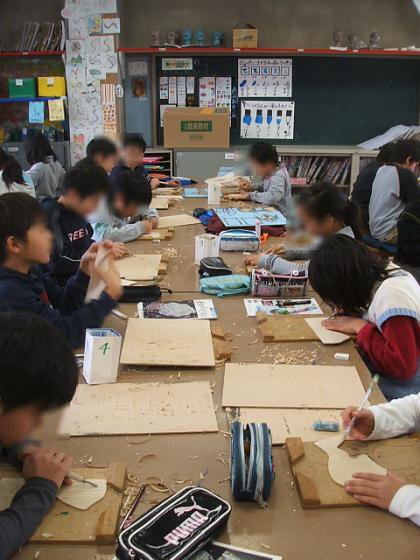 前回は様々な板切れを生き物に見立て、彫刻刀で線彫りしました。